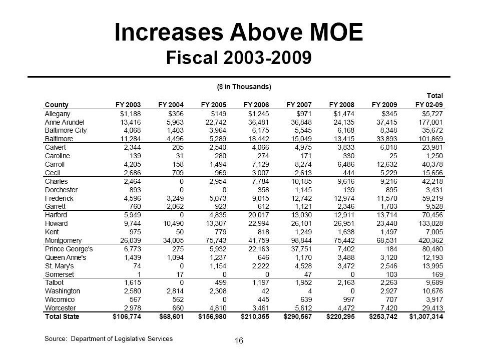 The Maryland Legislative Information Services’ website contains the following data on above-MOE expenditures since Fiscal Year 2003. Effectively, these are the amounts by which each county has exceeded its prior year’s local funding for public schools.