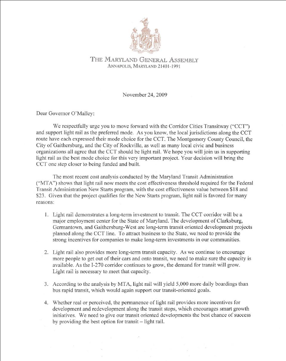 A group of thirteen Montgomery County state legislators has written to the Governor asking him to select light rail for the Corridor Cities Transitway (CCT). The group includes every legislator from Districts 15, 17 and 39 – which account for the entire alignment of the project – except for Delegate Luiz Simmons (D-17). Additionally, District 14 Delegate Karen Montgomery and District 14 Senator Rona Kramer signed on. Kramer, along with District 39 Senator Nancy King, is a member of the Senate’s critical Budget and Taxation Committee. The County Council voted 6-3 to support light rail, with Council Members Phil Andrews, Marc Elrich and Roger Berliner supporting bus rapid transit instead.