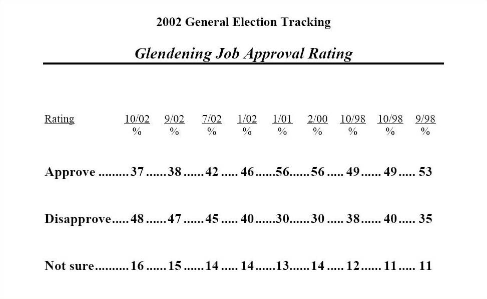 In that same poll, 51% of the respondents agreed with this statement: “Kathleen Kennedy Townsend would just continue the policies of the Glendening administration. It’s time for a change.” Thirty-eight percent disagreed. Glendening was clearly a drag on his Lieutenant Governor’s candidacy against Ehrlich.