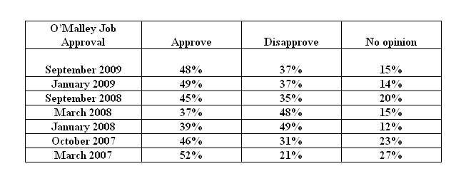 Interestingly, O’Malley’s low point in March 2008 (37% approve/48% disapprove), which came after the tax-hiking special session, was identical to Glendening’s ratings in October 2002. But O’Malley has recovered since then even though the economy has headed south. Could O’Malley’s approval ratings fall again? Sure, but he is lacking one key component of Glendening’s unpopularity: personal failings. O’Malley has no problems resembling Glendening’s marital drama, his war with Schaefer or his iciness with the press. That will offer him some protection from the negative effects of a bad economy.