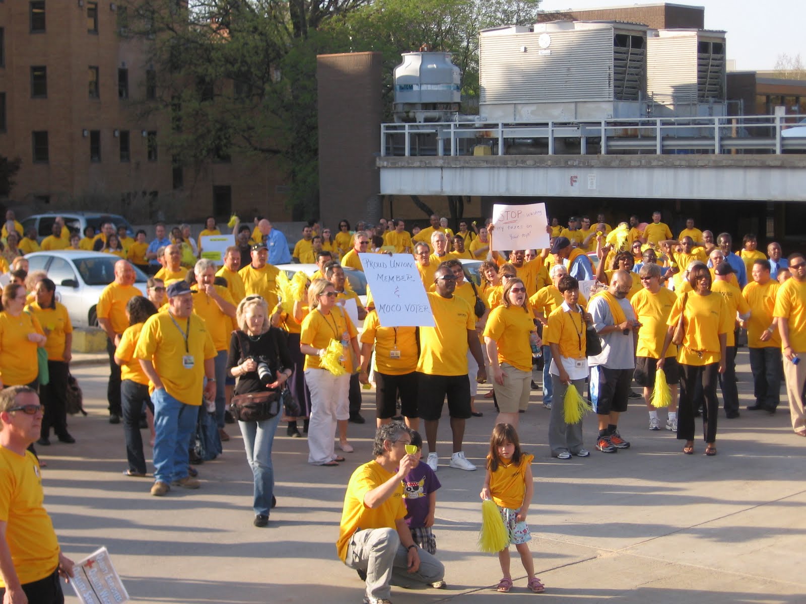 They came from every corner of the county, from every race, age and ethnicity of humankind, united only by their shirts of radioactive yellow. That is the war color of MCGEO, the giant Montgomery County government employees union. The union leaders sent out their call and in swarmed the members last night, over five hundred in number. First they yelled defiantly at the council building, fists pumping and signs aloft. Then they invaded.
