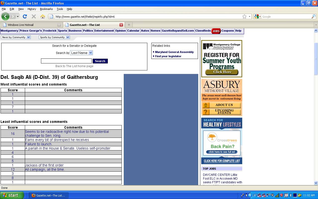 Respondents were not permitted to fill out partial lists and were given the option to make comments for each legislator. We obtained the email and posted it on our blog, as well as the link to Survey Monkey. The key to understanding the survey is that the Gazette had no control over who filled it out and had no idea who was completing it. That’s akin to how we run our Wild-West-style reader polls, which are frequently stuffed, but does not resemble at all how we run our MoCo Most Influential surveys. On the latter surveys, we ask our well-connected spy network for input and never accept anonymous responses. We know exactly who is responding and what they say, thereby assuring some minimal level of quality control. Such is not the case with the Gazette’s poll, as we shall see.