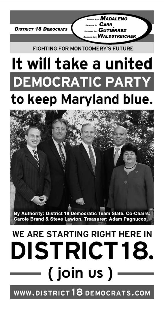 N New District 18 Democratic Team Ad April 22, 2010 1 Min Read This ad will be appearing in the Montgomery County Democrats spring ball program. Categorized in: Maryland Politics Watch ArchivePolitics Tagged in: Al Carr, Ana Sol Gutierrez, District 18, Jeff Waldstreicher, Rich Madaleno Share Article: