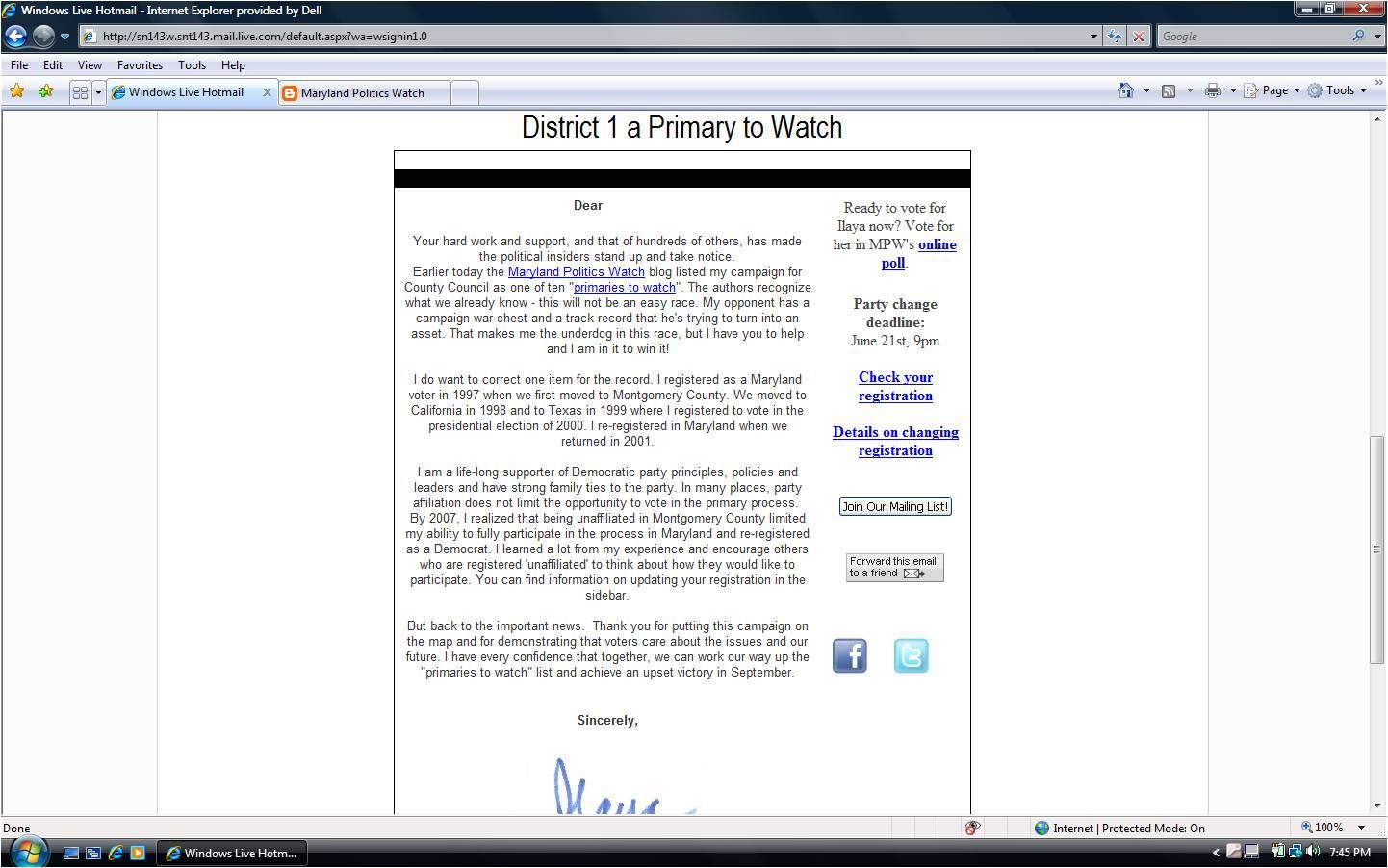 Council District 1 candidate Ilaya Hopkins sent the following email to her supporters last night explaining her previous history as an unaffiliated voter and urging them to vote in MPW’s poll on her race. Hopkins’s email was remarkably effective in moving our poll from an early 80% advantage for Roger Berliner to more than 50% supporting the challenger before Berliner recovered. Now they’re running neck and neck, which is really good for Hopkins.