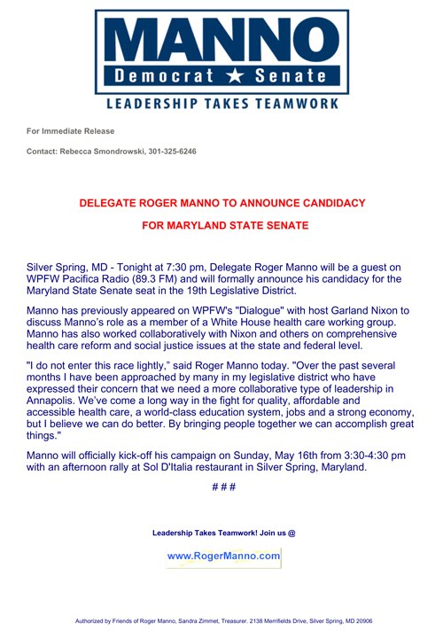 M Manno to Announce for District 19 Senate Tonight April 27, 2010 1 Min Read Categorized in: Maryland Politics Watch ArchivePolitics Tagged in: District 19, Roger Manno Share Article: