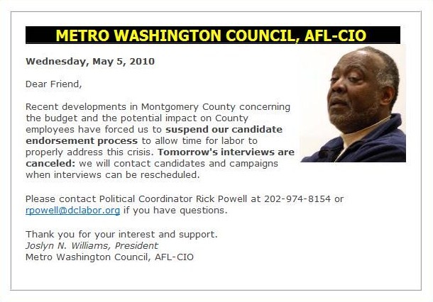 In the clearest sign yet of labor discontent with the County Council, the Metro Washington AFL-CIO has suspended its endorsement process for council candidates because of the county budget “crisis” and its impact on affiliated unions. This sort of action by the labor federation may be unprecedented in MoCo politics.