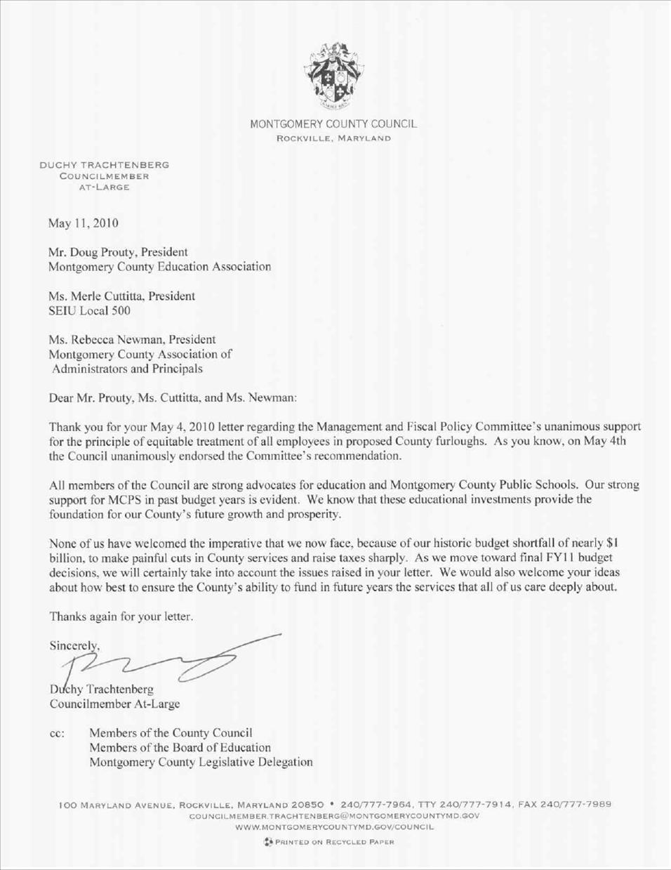 On May 4, the three school unions – MCEA, SEIU Local 500 and the Supervisors – sent a long joint letter posing multiple questions about furloughs and proposing alternatives. So Council Member Duchy Trachtenberg, Chair of the council’s Management and Fiscal Policy Committee, sent a response and that made the cats scratch and hiss!