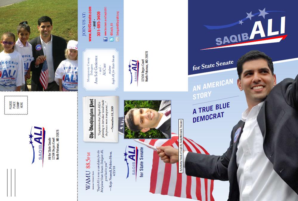 Delegate Saqib Ali has released his first lit piece for his Senate campaign, and it’s a good one. Note how he produces a positive mailer while still setting up future contrasts with Senator Nancy King on combined reporting, alcohol and the BOAST bill. He even claims credit for co-sponsoring the bill waiving MoCo’s Maintenance of Effort fine when his opponent lead-sponsored a similar bill. (Both passed overwhelmingly.) He’s a cheeky one, that Saqib! We expect Ali to sharpen the contrasts with King as the campaign proceeds.