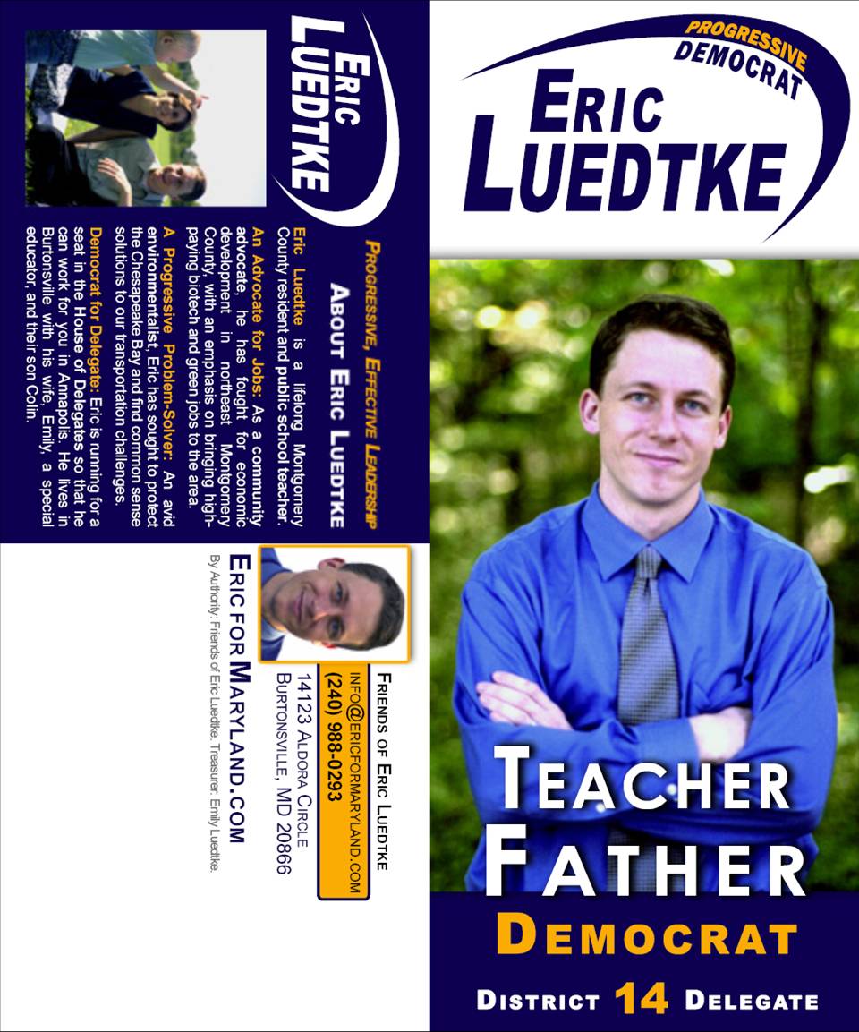 District 14 Delegate candidate Eric Luedtke has released his first lit piece, which he will use in door-knocking. Note how he uses quotes from our Young Guns series in which our spies voted him one of the most influential people up through age 35 in MoCo. We just love candidates who pass out lit mentioning our blog to thousands of county residents!