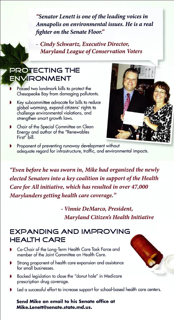 But LCV does not appear to be holding this against Lenett. LCV Executive Director Cindy Schwartz appeared in Lenett’s literature last fall, saying, “Senator Lenett is one of the leading voices in Annapolis on environmental issues. He is a real fighter on the Senate Floor.”