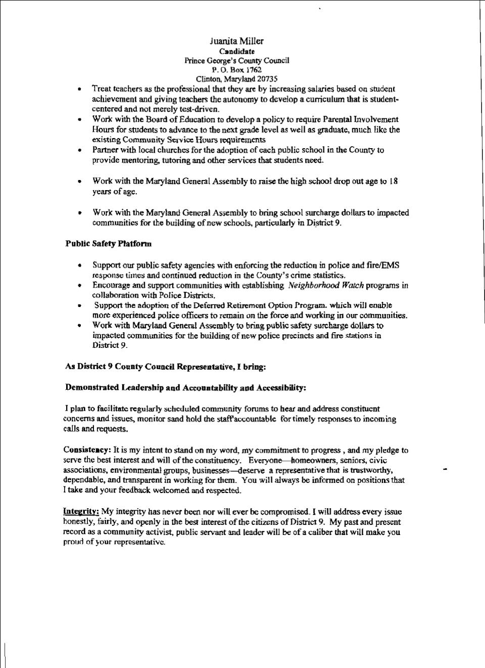 Last week, Miller spoke to a meeting of the Hampton Home Owners Association in Brandywine and Brown showed up to listen. Miller distributed the following flyer laying out her platform to attendees. Note the lack of an authority line – a classic violation of Maryland election law.