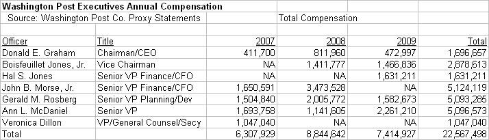 The Post does not detail salaries and benefits for all of its executives in its SEC filings, but it does mention compensation for Katharine Weymouth, the Post’s publisher since February 2008. Weymouth’s salary was $220,000 in 2007, $500,000 in 2008 and 2009 and will be $550,000 starting in April 2010. She received performance bonuses of $108,167 in 2007, $33,263 in 2008 and $462,630 in 2009. The Post’s newspaper division lost $193 million in 2008 and $164 million in 2009, probably the two worst years ever in the history of the paper. As the company cannot possibly be rewarding Weymouth for the newspaper’s financial returns, they must be rewarding her for the infamous “Dinnergate” scandal.