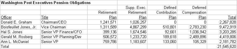 Washington Post executives qualify for FOUR different pension programs. First, they are enrolled in The Retirement Plan for Washington Post Companies, which is the defined benefit plan in which many company employees are enrolled. Second, they participate in the Supplemental Executive Retirement Plan (SERP), which the company says “was designed to retain and recruit key executives. Participants in the SERP, including named executive officers, are selected by management as employees whom management most wants to retain, because of their superior performance, and approved by the [Compensation] Committee.” Unlike the retirement plan for other employees, the SERP uses bonuses in its benefit formula. Third, the SERP contains a supplemental defined contribution plan which functions much like a 401(k), with the company matching executive contributions. And fourth, executives can participate in a deferred compensation plan, which allows them to delay receipt of pay and invest it in their choice of investment indexes until they retire.