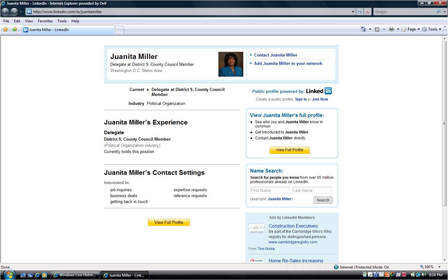 Well, maybe not, but you might believe that if you were asking Prince George’s County Council candidate Juanita “Wild Child” Miller. On her Linkedin profile, she describes herself as “Delegate at District 9, County Council Member.”