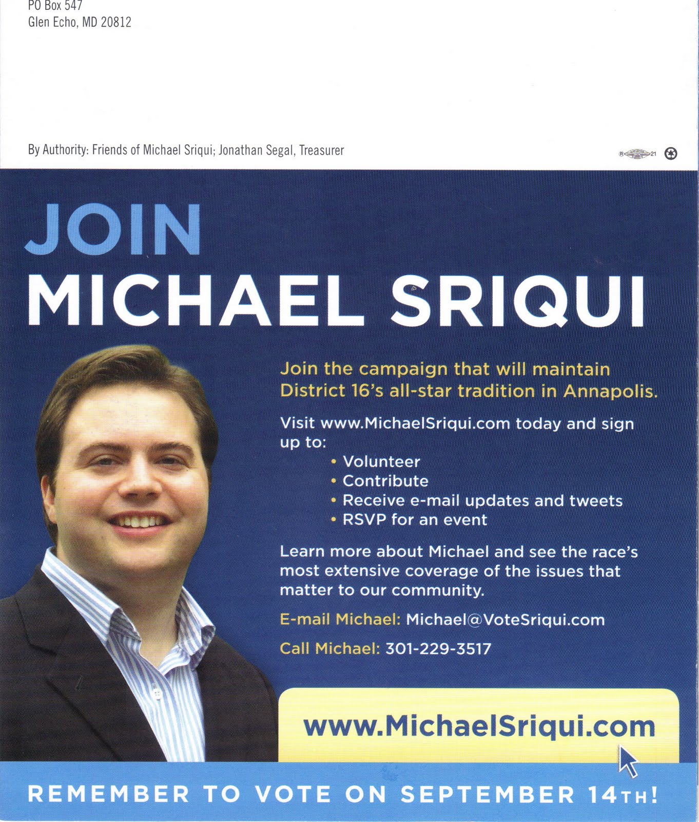 M Michael Sriqui’s First Lit Piece July 4, 2010 1 Min Read Categorized in: Maryland Politics Watch ArchivePolitics Tagged in: District 16, Michael Sriqui Share Article: