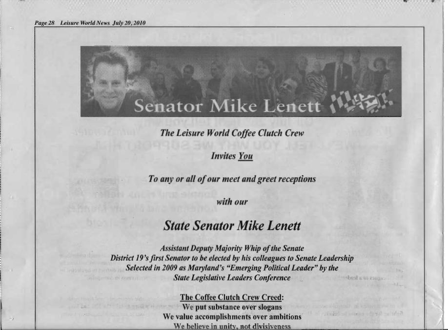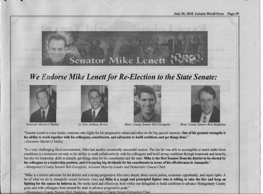 District 19 Senator Mike Lenett and challenger Roger Manno are waging an intense struggle in Leisure World, the largest single location of votes in the district. In 2006, 14% of all Democratic primary votes for Senate were cast in Leisure World. In the Delegate race, Leisure World accounted for 15% of all primary votes. Our spies in the highly coveted enclave report that both candidates are working so hard for support that they are virtually living there. Following are their latest ads from the July 20 edition of Leisure World News.