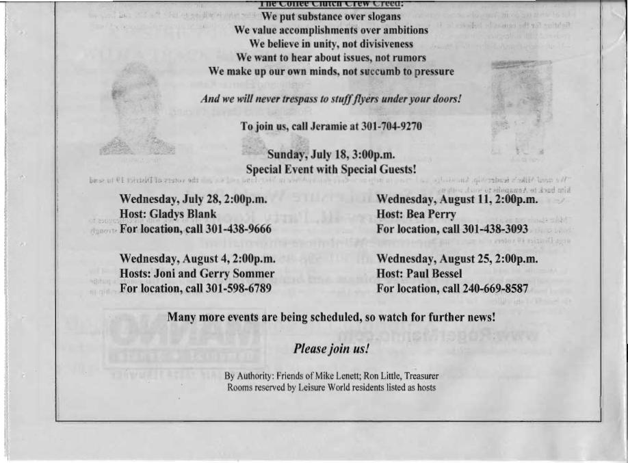 This is Mike Lenett’s colossal two-page ad, in which he repeats his “Coffee Clutch Crew Creed” and promises not to “trespass” by stuffing flyers under residents’ doors. He also includes a grab-bag of endorsement quotes.