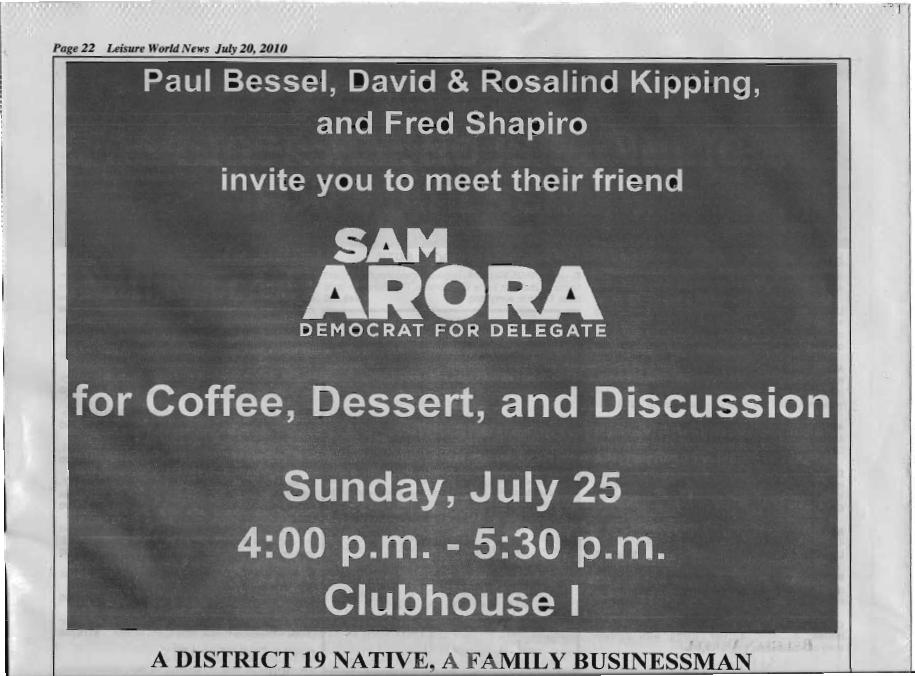 A Arora All In for Leisure World July 30, 2010 1 Min Read Here’s another ad in Leisure World News from District 19 House candidate Sam Arora. So where are the other D19 house contestants, not to mention the at-large council contenders? Categorized in: Maryland Politics Watch ArchivePolitics Tagged in: District 19, Sam Arora Share Article: