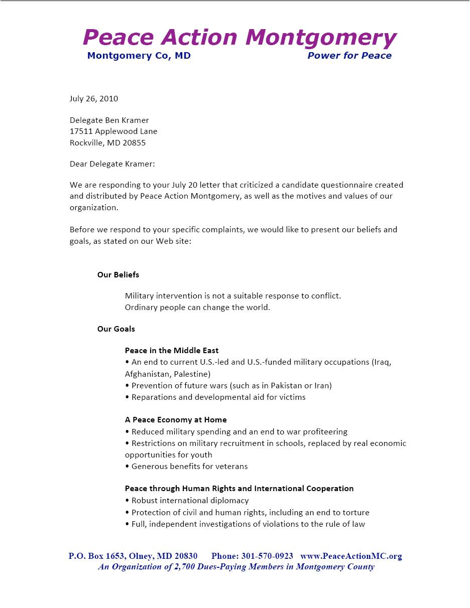 We are responding to your July 20 letter that criticized a candidate questionnaire created and distributed by Peace Action Montgomery, as well as the motives and values of our organization.