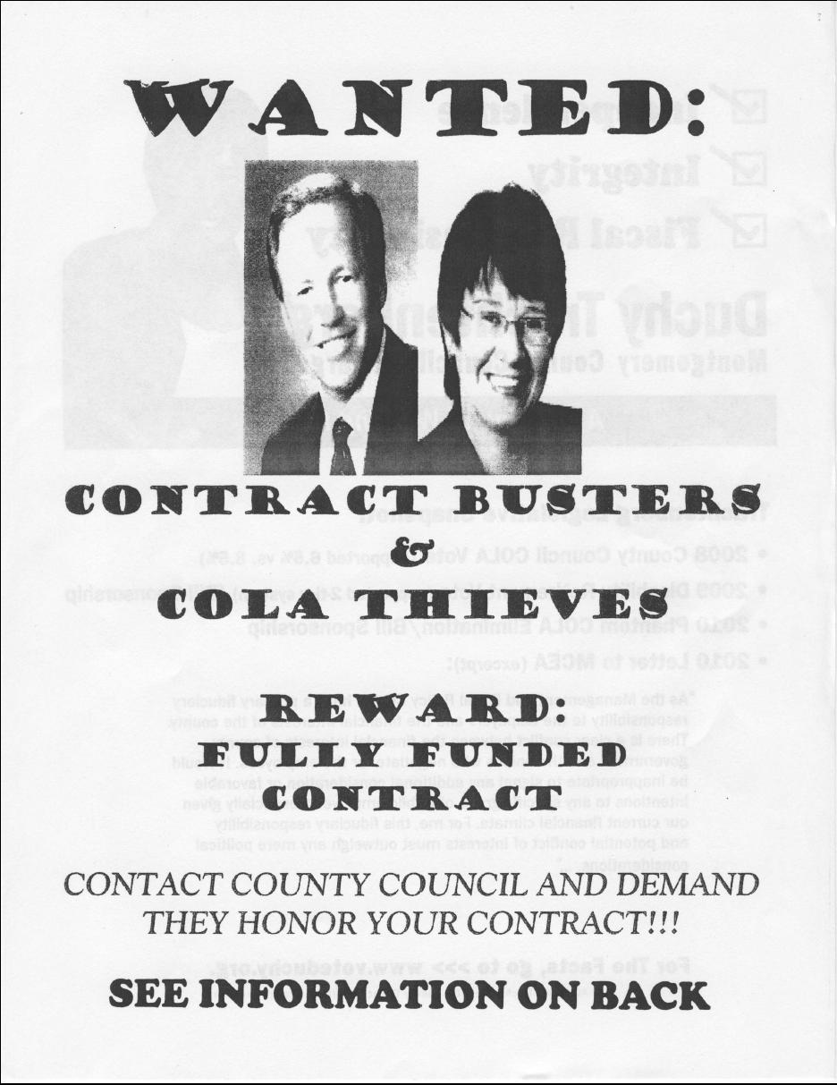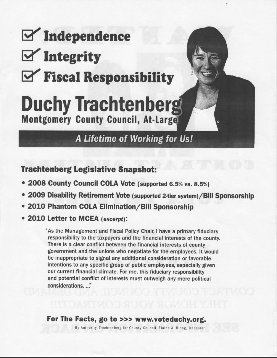 Your author remembers this flyer well. It was a slam piece against Trachtenberg and Phil Andrews handed out by MCGEO when they proposed trimming two points from the county employees’ cost of living adjustment in 2008. (How quaint that fight now seems.) My first thought was that MCGEO had come to the forum to harass Trachtenberg. But no MCGEO staffers or members were in attendance.