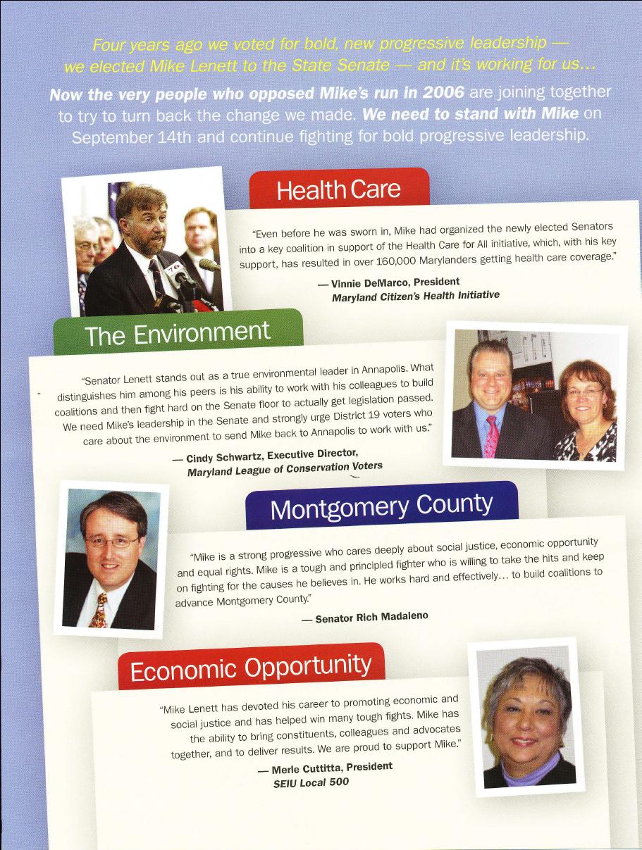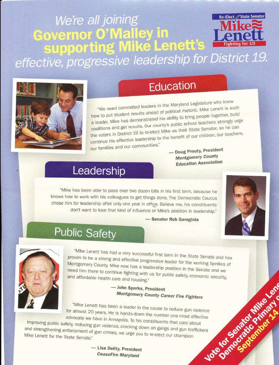 2. One of Manno’s assets is that he has been endorsed by former Senator Len Teitelbaum and former Delegates Adrienne Mandel and Carol Petzold. Teitelbaum stepped down rather than face Lenett in 2006, and both Mandel and Petzold were defeated by Lenett for the Senate seat. Lenett is attempting to turn their support for Manno to his advantage with this language: