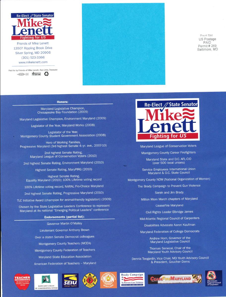 Here is Lenett’s latest mailer, which arrived in door slots last week.