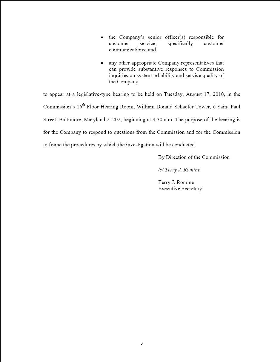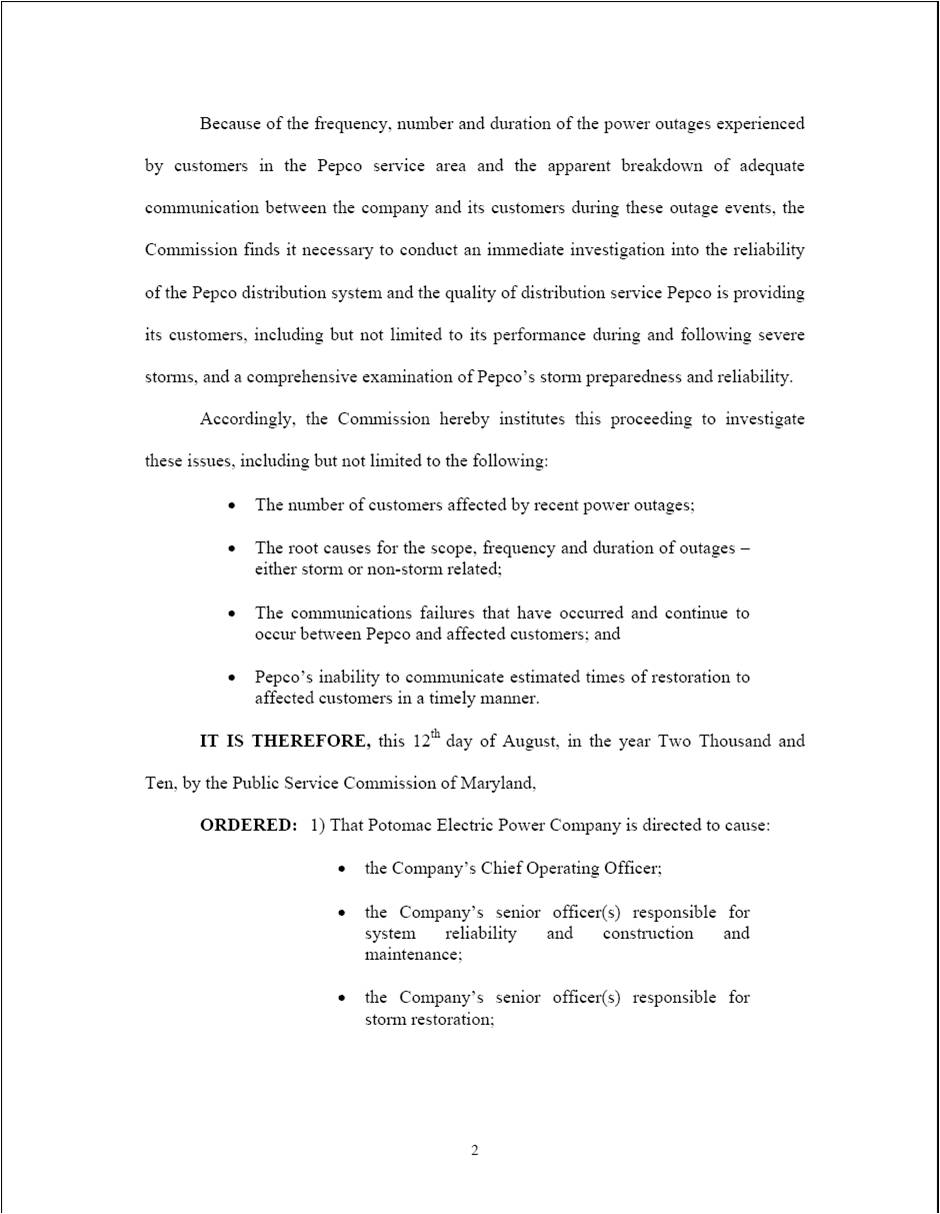 In response to numerous complaints by elected officials, the Public Service Commission (PSC) has announced an investigation of Pepco’s service reliability. Following is its order.