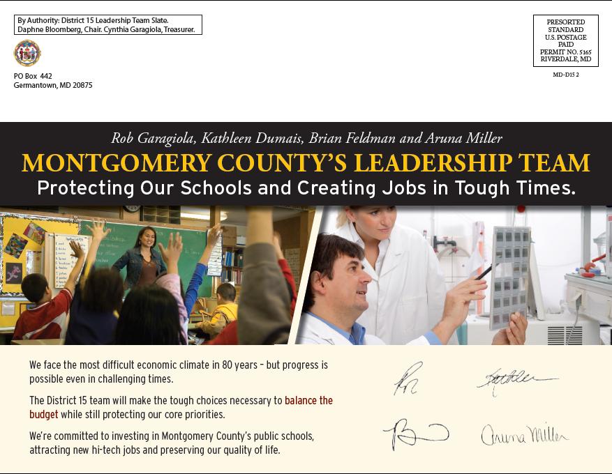 D District 15 Leadership Team Lit Piece August 17, 2010 1 Min Read This piece promotes the District 15 Leadership Team, which includes Senator Rob Garagiola, Delegates Brian Feldman and Kathleen Dumais and Delegate candidate Aruna Miller. This is the third slate to do joint literature after Districts 16 and 18. Categorized in: Maryland Politics Watch ArchivePolitics Tagged in: Aruna Miller, Brian Feldman, District 15, Kathleen Dumais, Rob Garagiola Share Article: