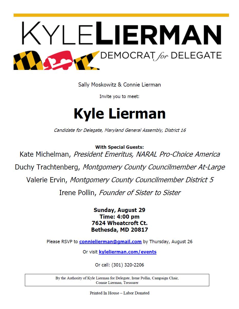 As Josh Kurtz reported this morning, former national NARAL President Kate Michelman is headlining an event for District 16 House candidate Kyle Lierman. This is a slap for Ariana Kelly, who was once Executive Director of NARAL in Maryland. Also in attendance will be Council Member Duchy Trachtenberg (who endorsed Lierman early) and Council Member Valerie Ervin. The notice appears below.
