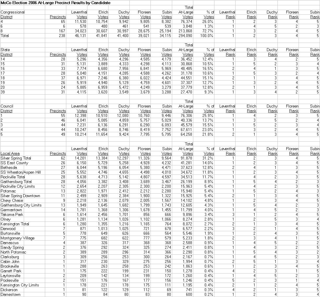 Here are 2006 at-large Democratic primary results for the top five candidates for all voters casting ballots at precincts by Congressional District, State Legislative District, Council District and locality. Our statistics are limited by the fact that precinct-level data excludes absentee and provisional voters. But we are using the precinct data to zero in on the geographic areas where each candidate ran strong and weak. That information is indispensable for evaluating possible results in 2010.