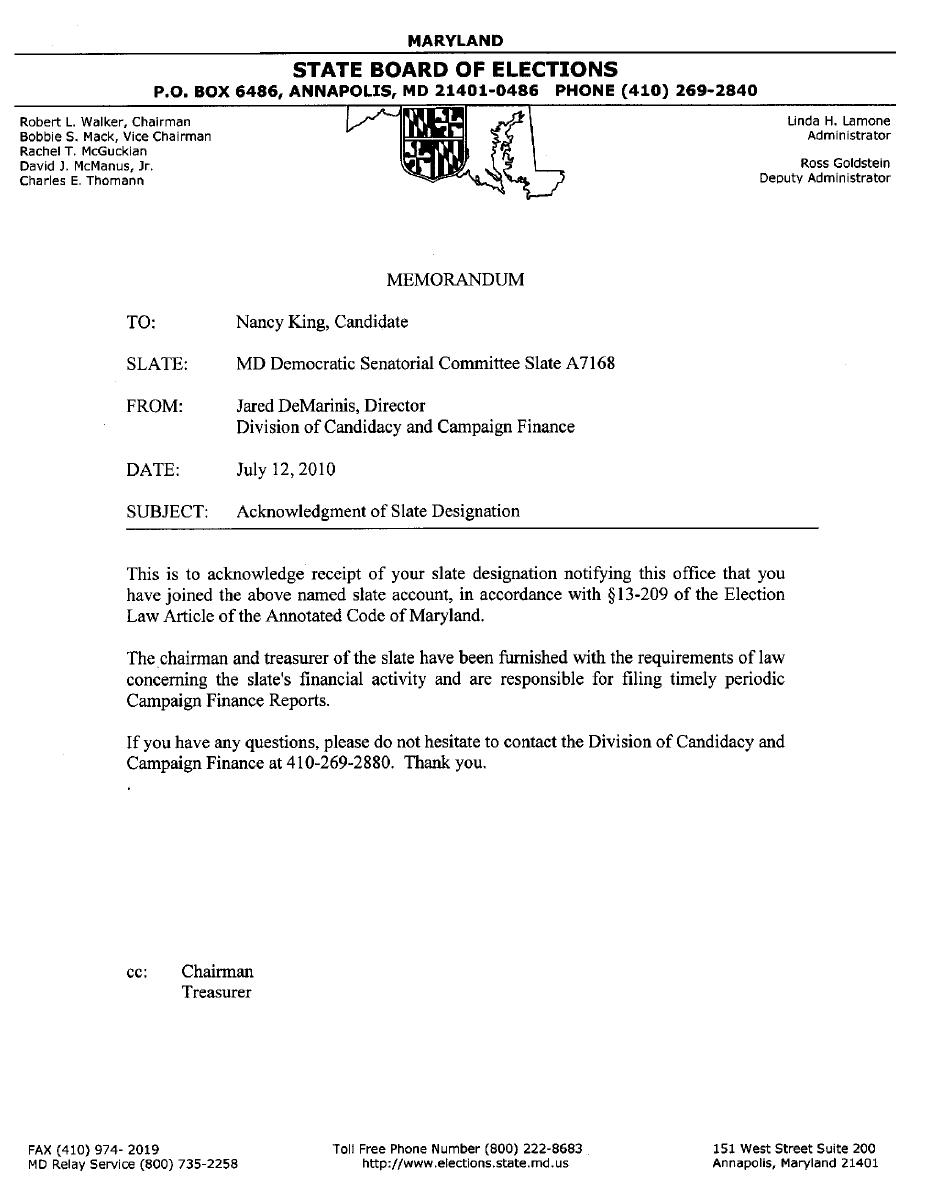 Attached you will find copies of documents from the Maryland State Board of Elections that show that Senator King did not join the slate until nearly two months after the expenditures you referenced.