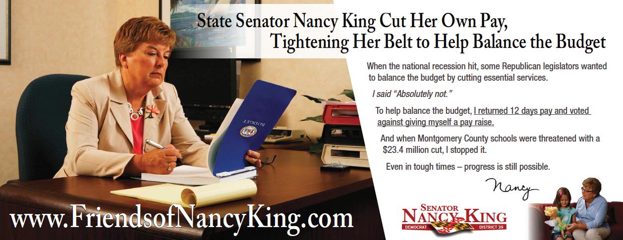 Senator Nancy King (D-39) is emphasizing the fact that she gave up a portion of her own legislative pay to help out on the state’s fiscal crisis in her first two mailers, which we reprint below. We still have fond memories of slamming other politicians who contributed colossal amounts of self-financing to their campaigns but did not give back any of their legislative salaries!