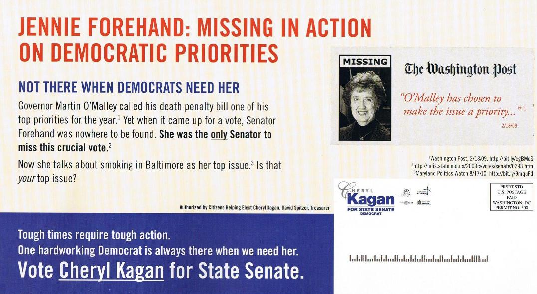 District 17 Senate challenger Cheryl Kagan has sent out a mailer criticizing incumbent Jennie Forehand for missing a vote on the death penalty.