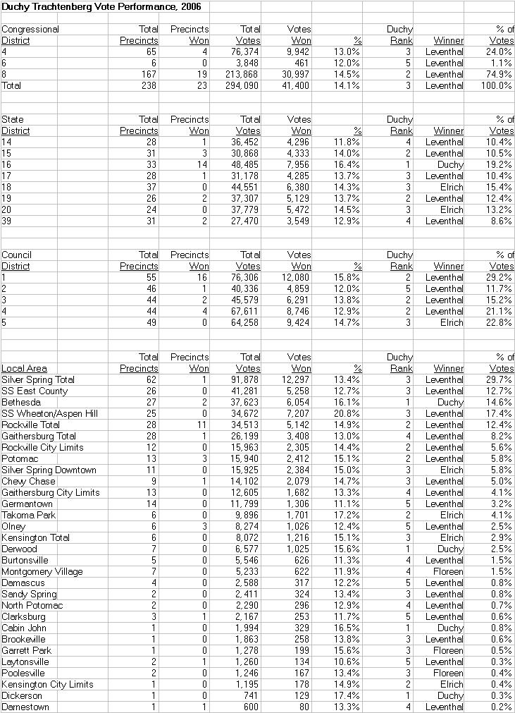 Where do we start? Trachtenberg ran as a pro-labor progressive in 2006 and was backed by virtually every union and liberal group in the county. But once Trachtenberg took office, she tried to kill the 2007 domestic worker protection bill, supported Ben Kramer over Nancy Navarro in the 2009 special election, threatened to sue officials with the National Organization for Women, accused Ike Leggett’s Executive Branch of acting like the KGB and declared war on the public employee unions. These kinds of incidents plus what even her allies at the Washington Post call her “cantankerous” personality have alienated a great many of her 2006 supporters. Trachtenberg’s most prominent endorsements now come from the Post and the Montgomery County Business PAC. No Democratic politician in the county has more enemies than Duchy Trachtenberg.