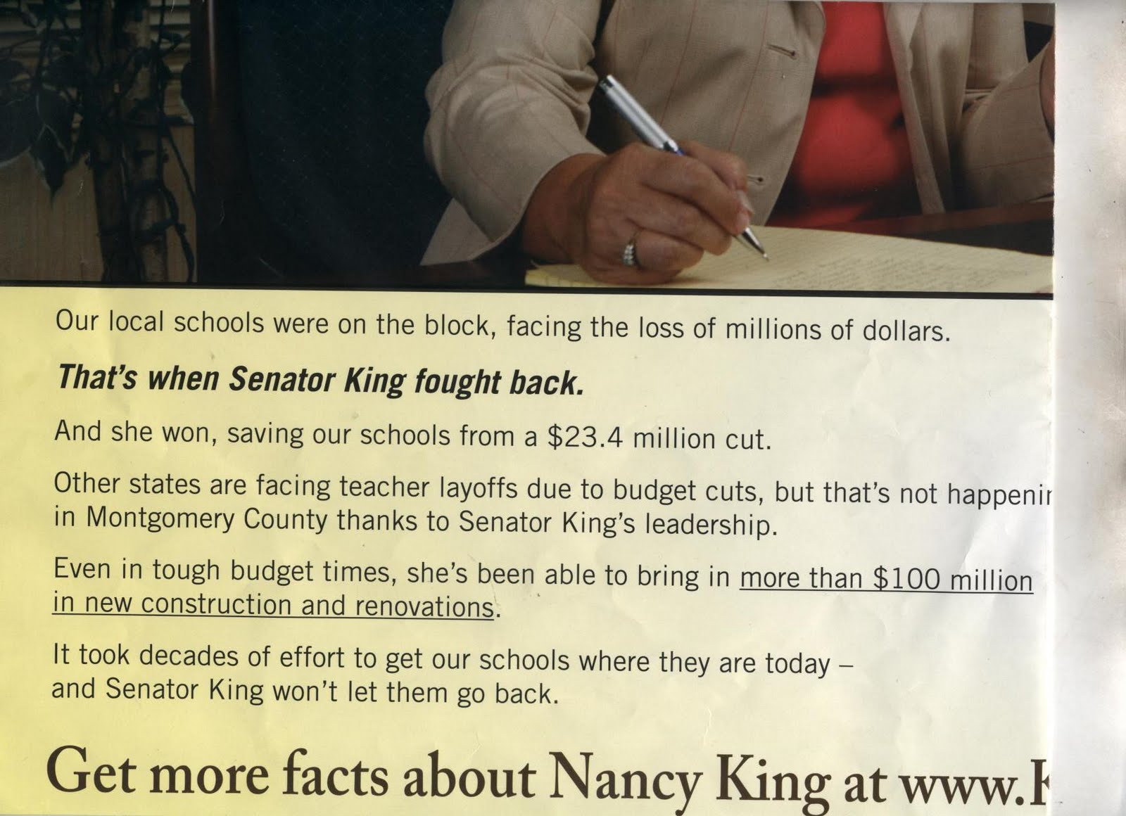 N Nancy King’s Education Mailer August 25, 2010 1 Min Read As a two-term member of the school board, a frequent endorsee of MCEA and a member of the Senate Budget and Taxation Committee’s education subcommittee, it makes sense that Senator Nancy King (D-39) would run on education. Categorized in: EducationMaryland Politics Watch ArchivePolitics Tagged in: District 39, Nancy King Share Article: