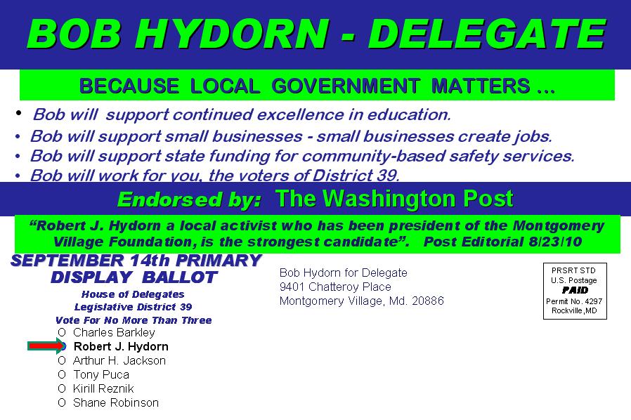 B Bob Hydorn’s First Mailer August 27, 2010 1 Min Read Categorized in: Maryland Politics Watch ArchivePolitics Tagged in: Bob Hydorn, District 39 Share Article: