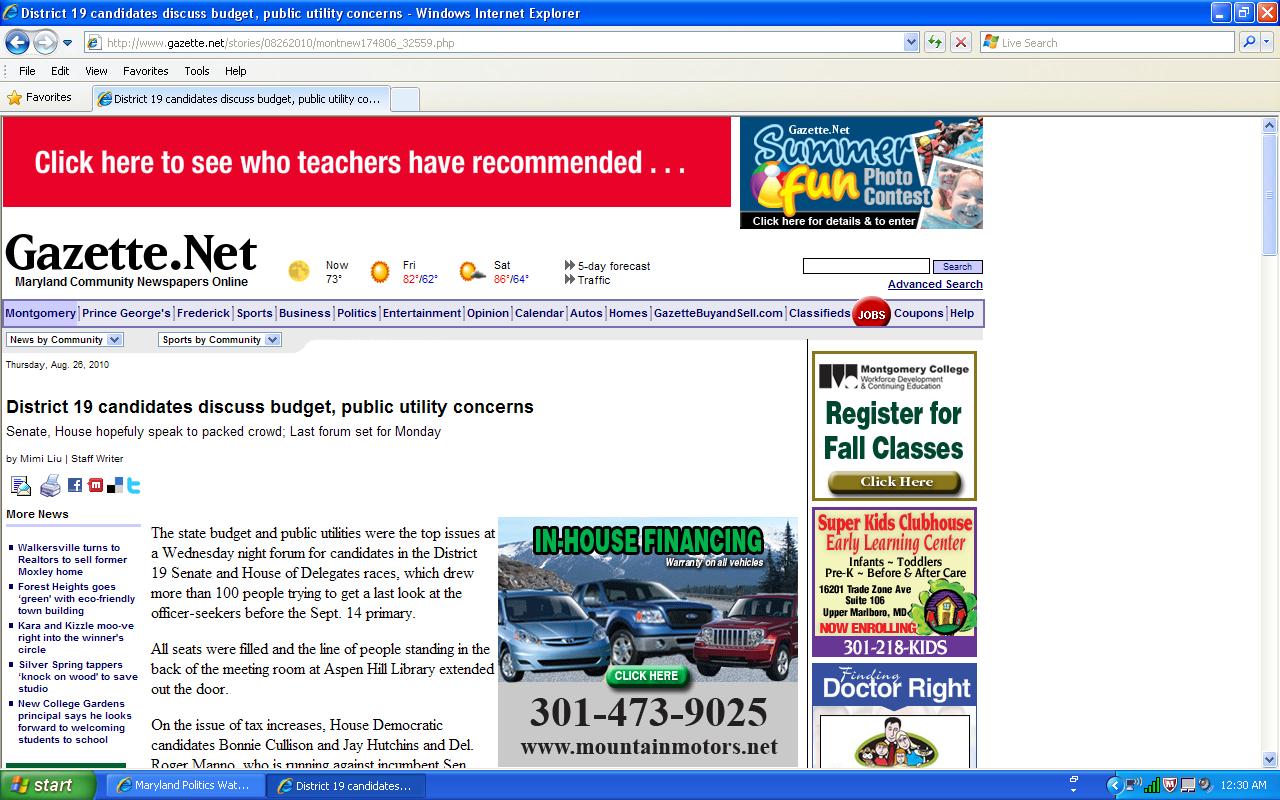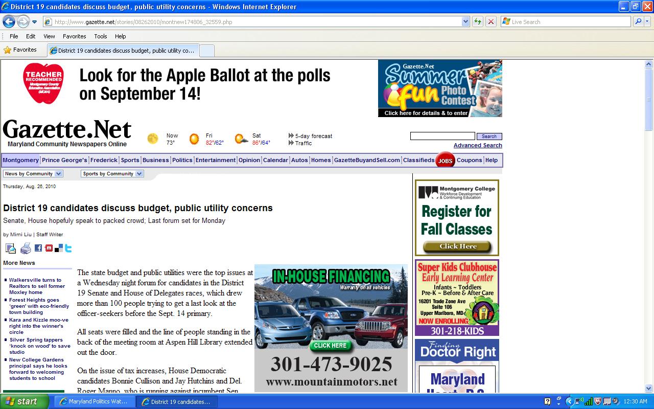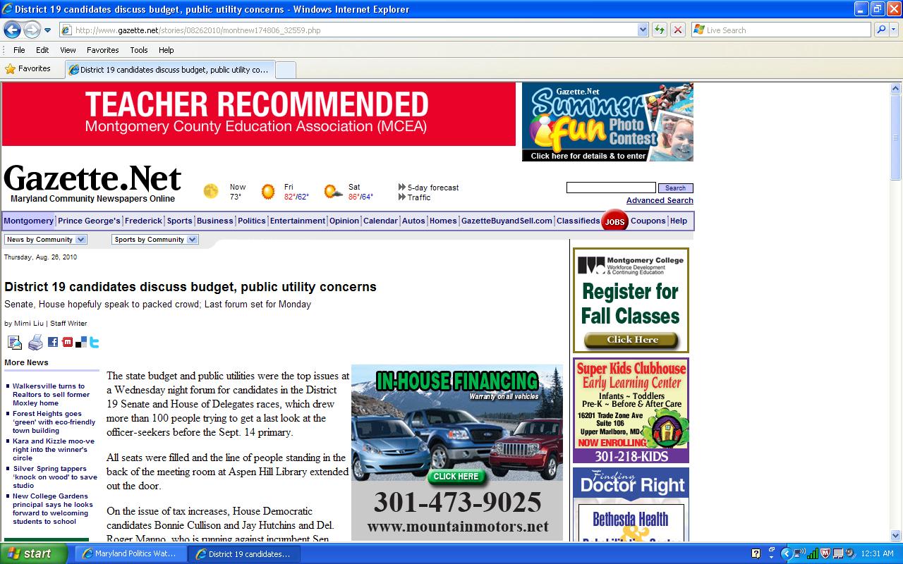Check out the rotating banner ad at the top left. The article covers a District 19 candidate forum.