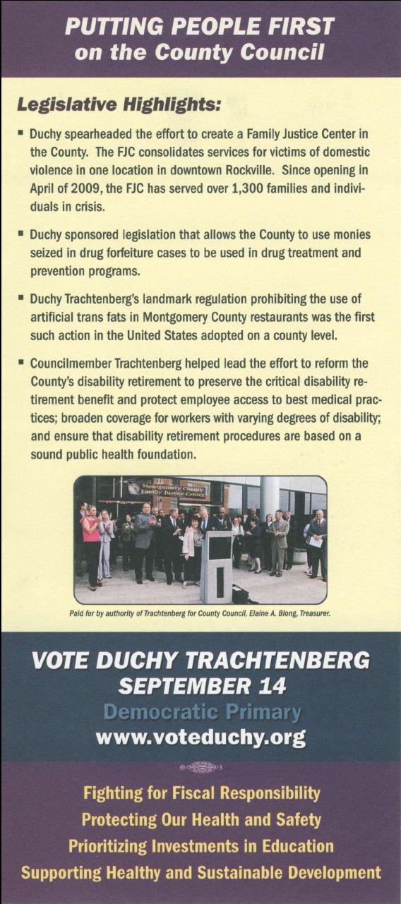 D Duchy Trachtenberg’s Walk Piece August 28, 2010 1 Min Read Categorized in: Maryland Politics Watch ArchivePolitics Tagged in: Council At-Large, Duchy Trachtenberg Share Article:
