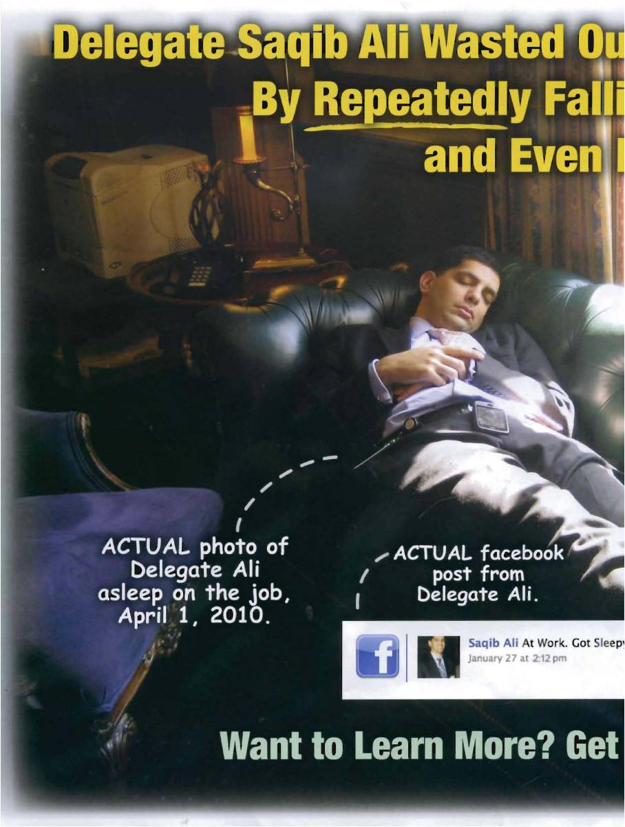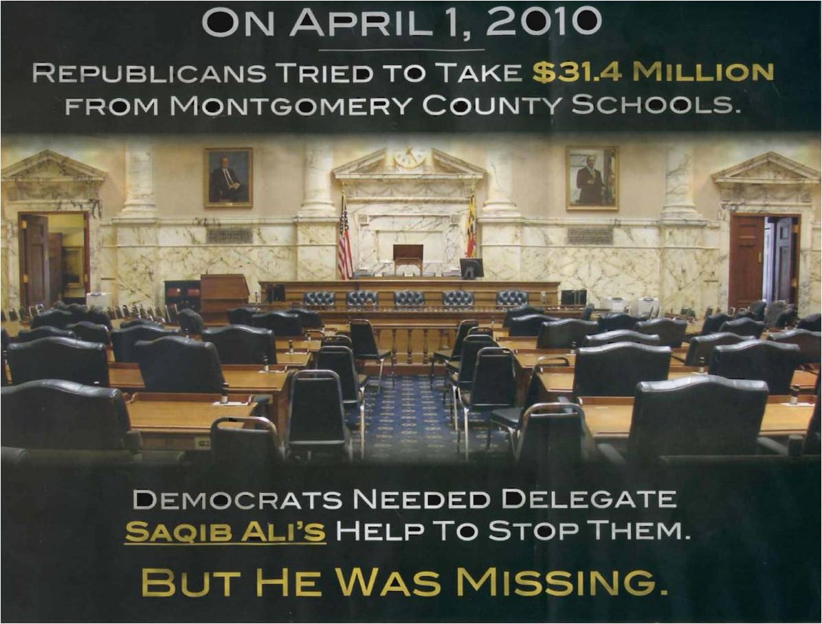 Until now, the standard for negative campaigning was set by the End Gridlock slate’s effort to defeat former Council Member Blair Ewing and former Senator Ida Ruben’s effort to get rid of Delegate Dana Dembrow, both of which succeeded. But King’s effort exceeds both of them in terms of the depth of her opposition research on Ali and the multitude of platforms she is using to convey it. The photos, the attack website, the attack blog and now the mailers probably constitute the most comprehensive campaign of political destruction ever conducted in MoCo.