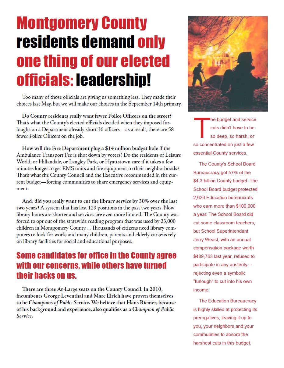 There are three At-Large seats on the County Council. In 2010, incumbents George Leventhal and Marc Elrich have proven themselves to be Champions of Public Service. We believe that Hans Riemer, because of his background and experience, also qualifies as a Champion of Public Service.