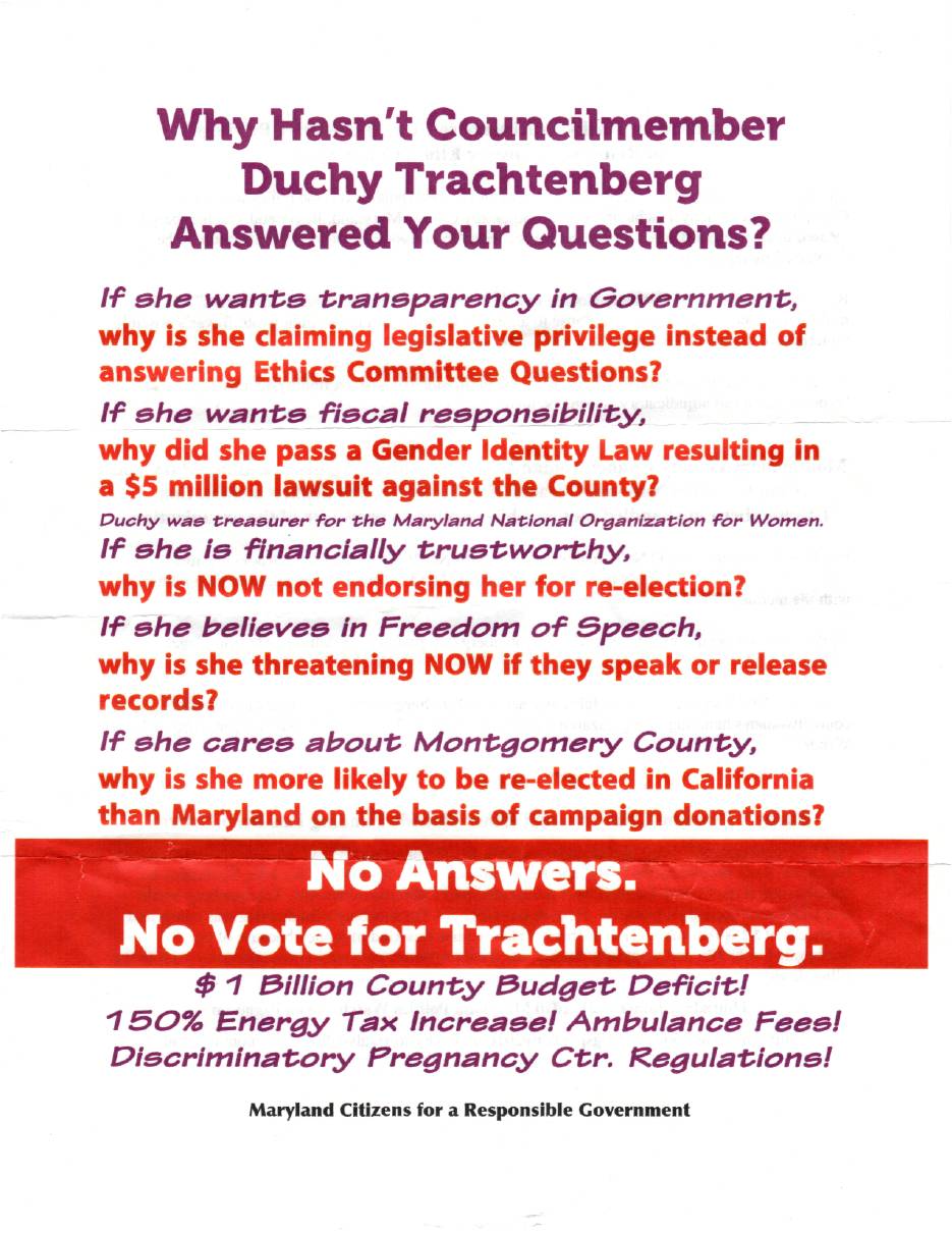 Maryland Citizens for a Responsible Government (MCRG), the group that opposed Montgomery County’s anti-transgender discrimination law, has begun distributing flyers targeting Council Member Duchy Trachtenberg at candidate forums. Here’s a copy, which cites MPW and the Gazette as its sources.