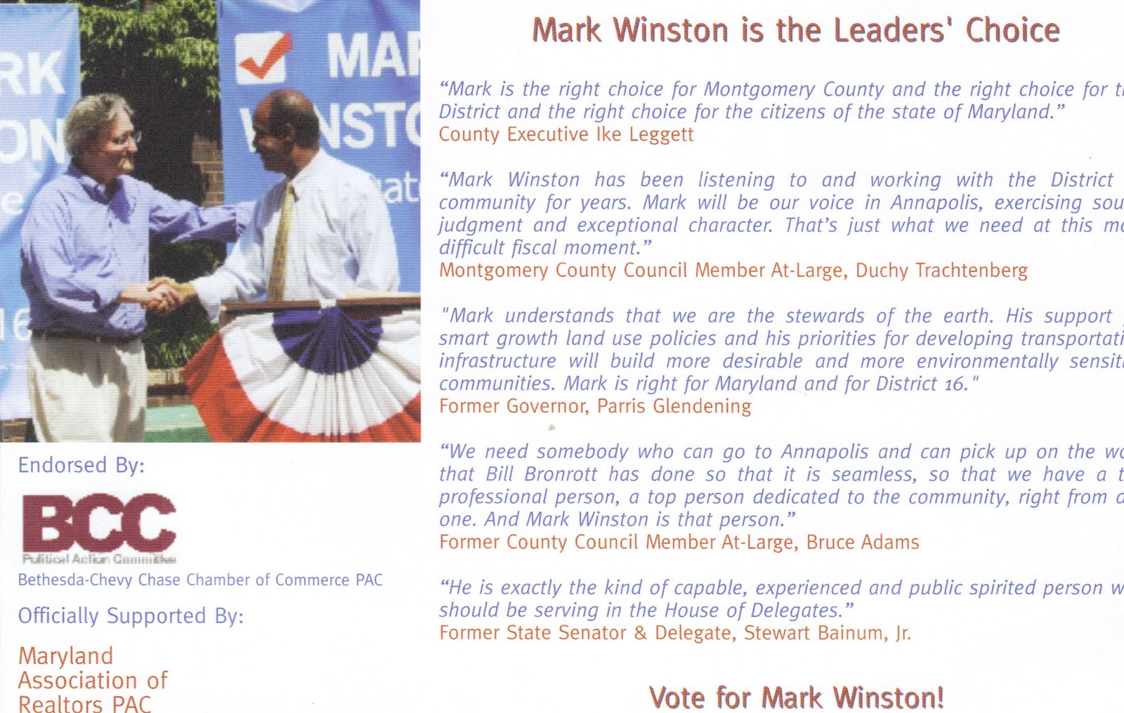 M Mark Winston’s Endorsement Mailer September 1, 2010 1 Min Read Categorized in: Maryland Politics Watch ArchivePolitics Tagged in: District 16, Mark Winston Share Article: