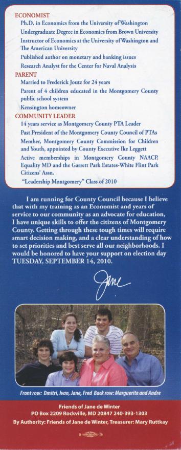 J Jane de Winter’s Walk Piece September 6, 2010 1 Min Read Categorized in: Maryland Politics Watch ArchivePolitics Tagged in: Council At-Large, Jane De Winter Share Article: