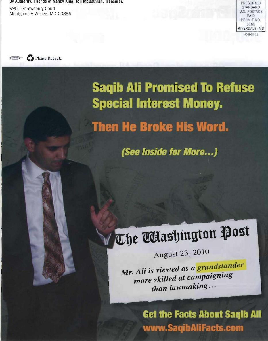 This is Senator Nancy King’s sixth(!) negative mailer in nine days. At least this time, Sleepy Saqib is replaced by Sleazy Saqib. Hey, isn’t Sleazy one of the Seven Dwarfs?
