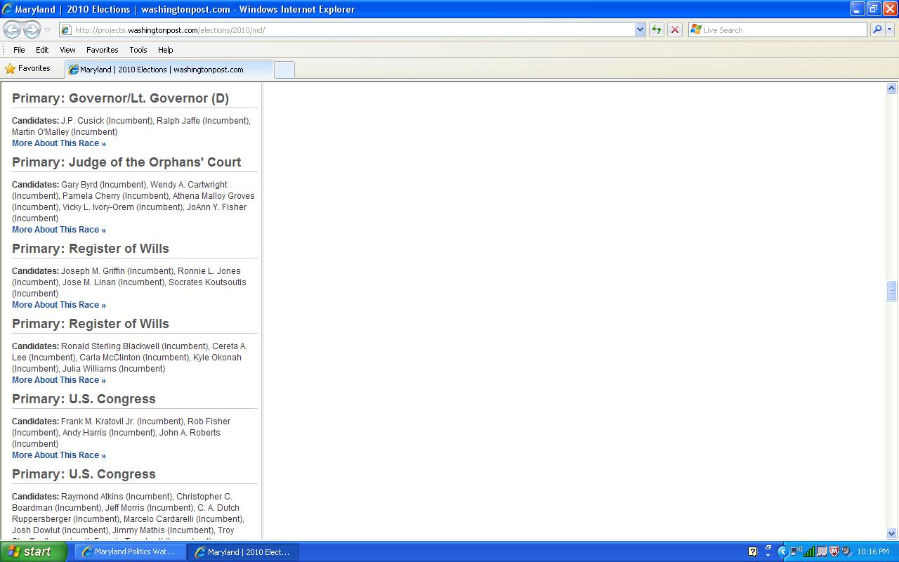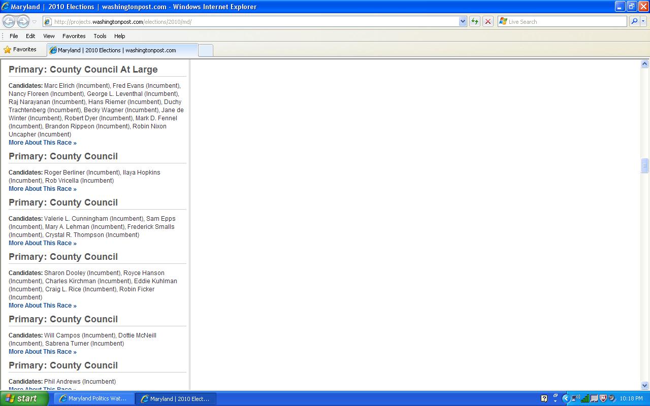 Remember the embarrassing typo-filled response sent by the editors of the Washington Post’s online voters guide to MoCo candidates who provided info to them? Well, it turns out that was only a hint of things to come. The resulting Maryland voters guide lists every single candidate as an incumbent. Actually, that’s not so surprising given the attention that Post bosses pay to our state.