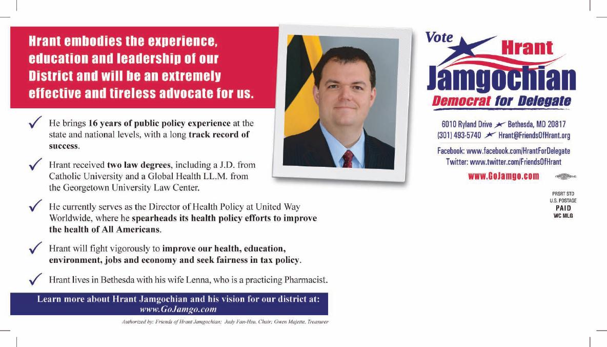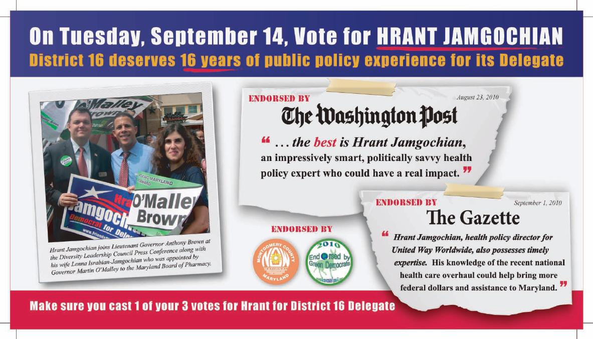 H Hrant’s Post and Gazette Mailer September 12, 2010 1 Min Read Categorized in: Maryland Politics Watch ArchivePolitics Tagged in: District 16, Hrant Jamgochian Share Article: