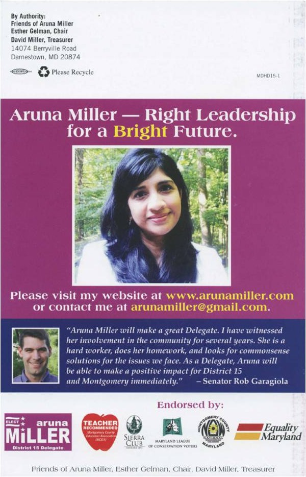 A Aruna Miller’s Mailer September 13, 2010 1 Min Read Categorized in: Maryland Politics Watch ArchivePolitics Tagged in: Aruna Miller, District 15 Share Article: