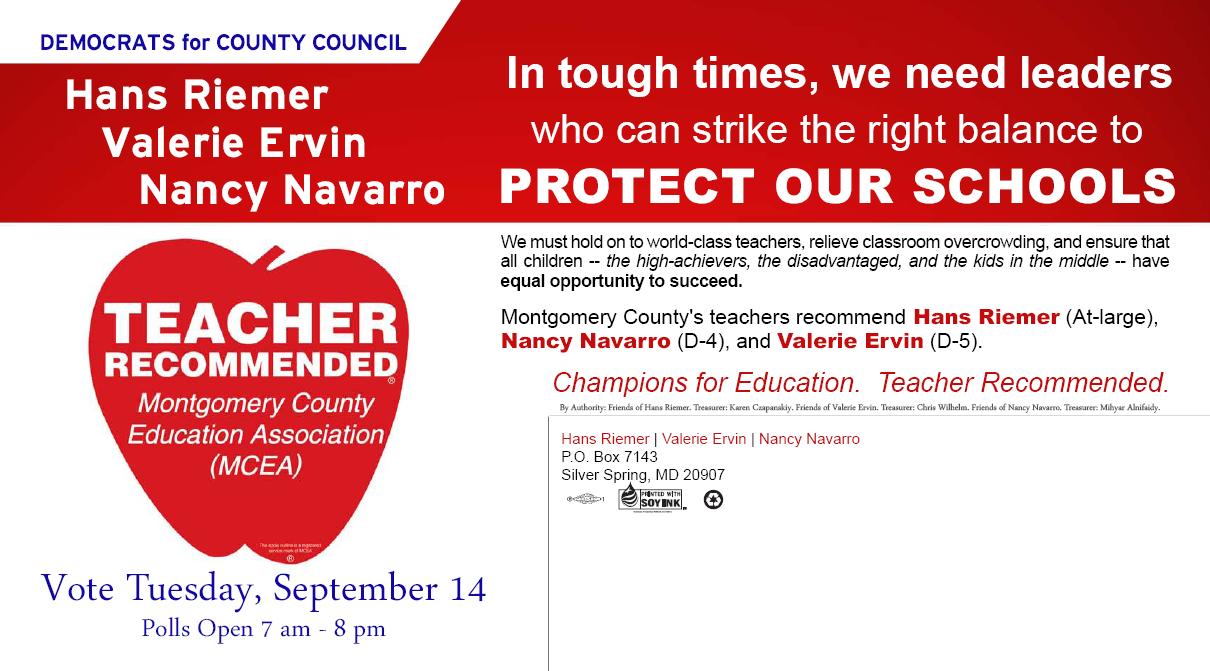 This mailer was produced not by MCEA, but by Council Members Nancy Navarro and Valerie Ervin and at-large candidate Hans Riemer, all of whom have endorsed each other and all of whom are on the Apple Ballot.