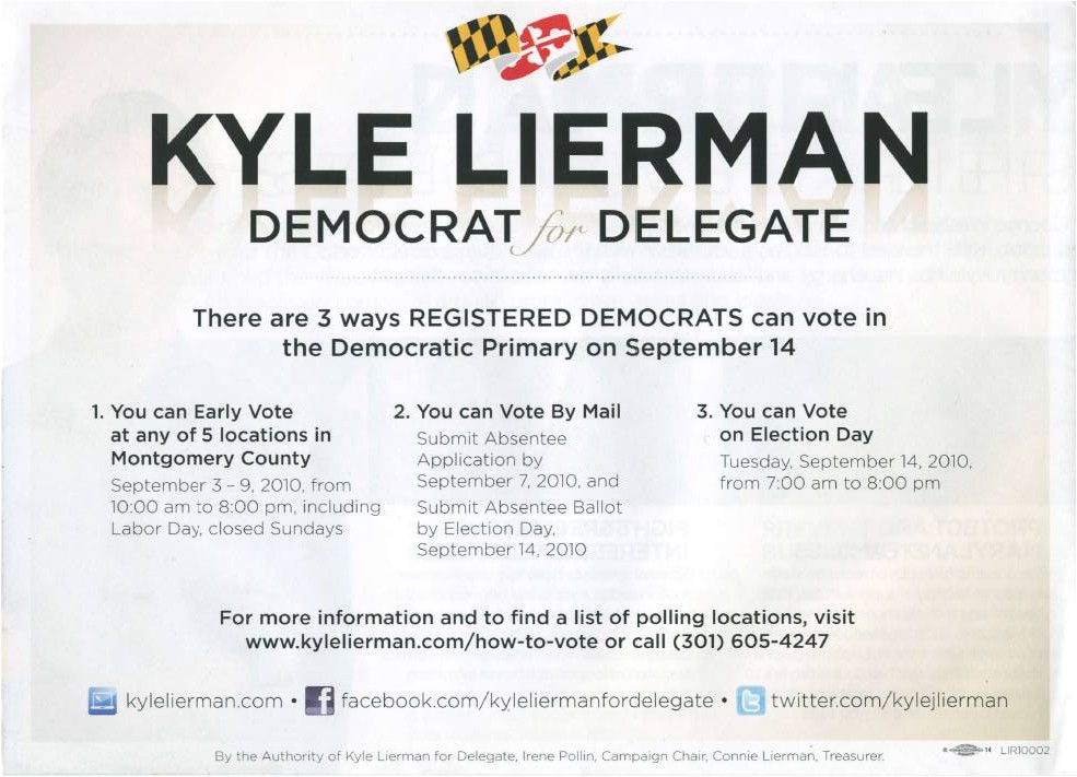 K Kyle Lierman’s Walk Piece September 13, 2010 1 Min Read Categorized in: Maryland Politics Watch ArchivePolitics Tagged in: District 16, Kyle Lierman Share Article: