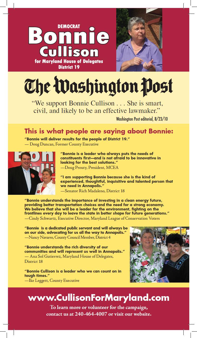 We’re still amazed that Bonnie was endorsed by the openly anti-union Washington Post, but perhaps they read this 2008 blog post in which our spies voted for her as one of MoCo’s most influential people.